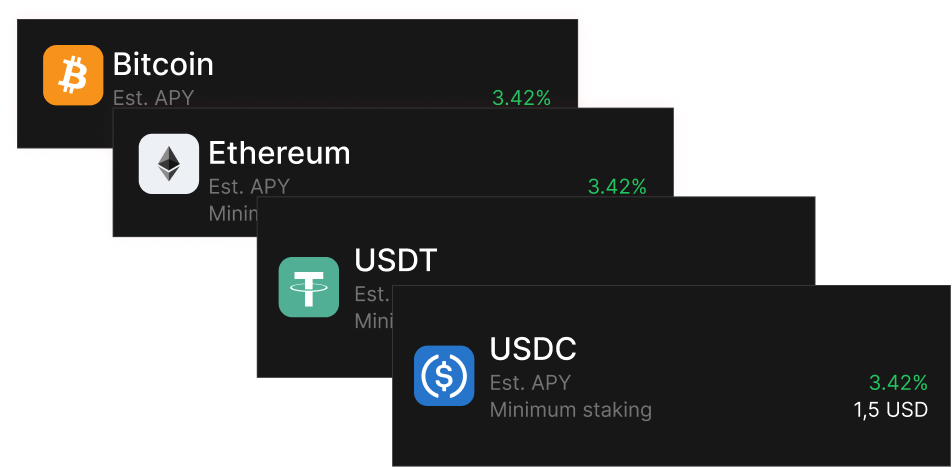 - Stake popular crypto assets such as BTC, ETH, USDT, and USDC to earn passive income.